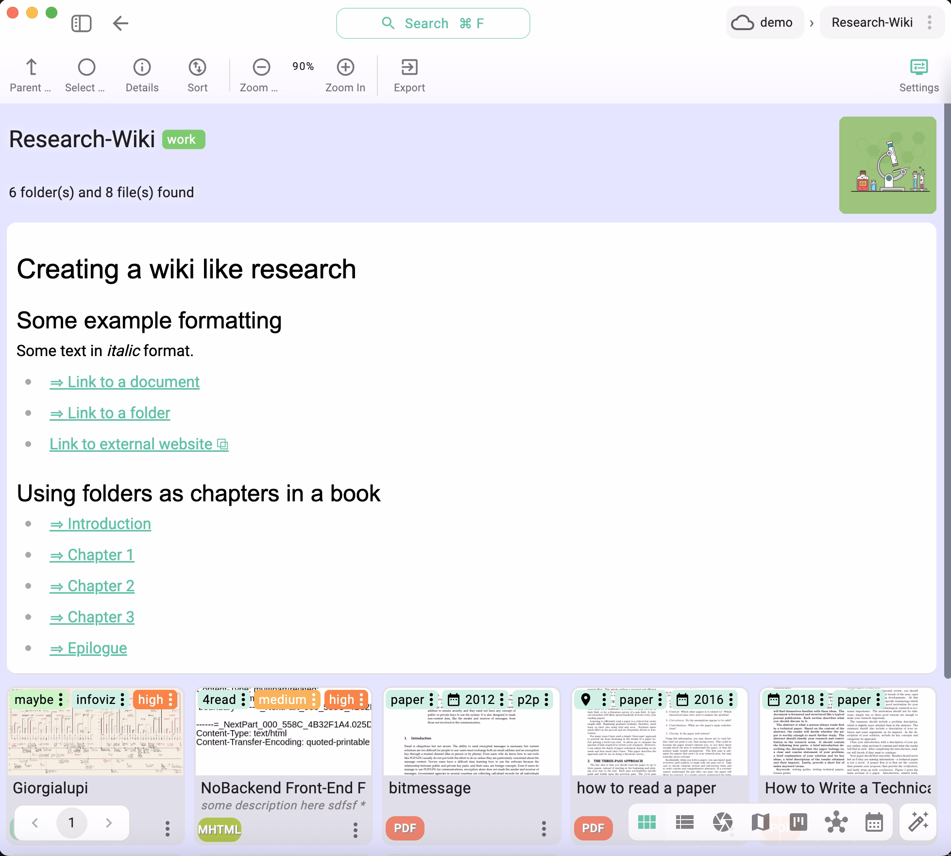 When folder descriptions are enabled, the folder description can act as a wiki-like page, with files listed below.