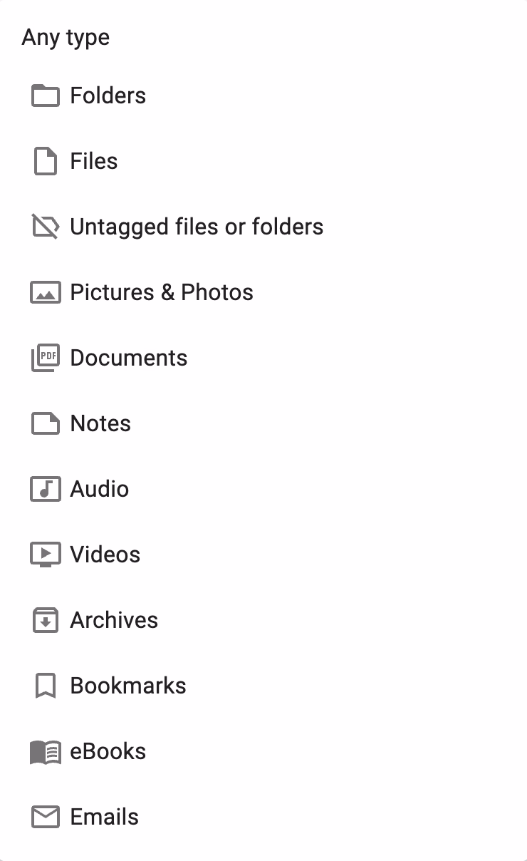 t:will present a list of supported file type groups, helping to narrow down the search results to documents, images, etc. - File size - Typing